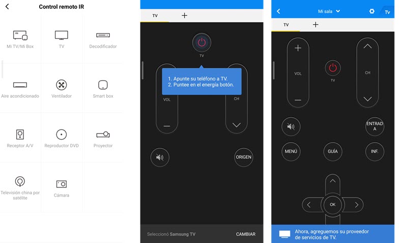 Y para ello, solo necesitas usar la aplicación Mi Remoto, que ya viene instalada como parte de las herramientas de Xiaomi. Tal como ves en las imágenes, tendrás que configurar cada uno de los dispositivos de forma individual siguiendo una serie de pasos.