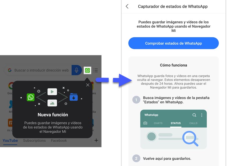 No necesitas descargar ninguna app ni buscar archivos ocultos en el móvil. Para descargar los estados de WhatsApp desde tu Redmi Note 9 o 9 Pro solo tienes que valerte de una de las funciones del navegador de Xiaomi.