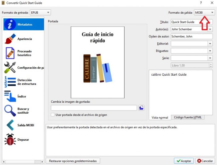 Tras realizar dicho paso, se nos abrirá una ventana en la que podremos modificar diversos aspectos del eBook; sin embargo, vamos a lo que nos interesa. En la parte superior derecha hay un apartado llamado “Formato de salida”, donde debemos hacer clic. Así, se abrirá una lista de todos los formatos en los que podremos convertir el libro electrónico. En la lista hay hasta 18 formatos, entre los que se encuentran ePUB, MOBI, PDF, ZIP, etcétera.