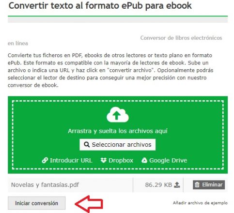 En este sentido, tenemos multitud de páginas. Una de ellas es Online-convert, si haces clic aquí entrarás directamente a su zona de conversión para formatos de eBooks. Basta con escoger el formato que queramos y se nos redigirá a un sitio en el que solo tendremos que arrastrar nuestro libro electrónico al cuadro señalizado.