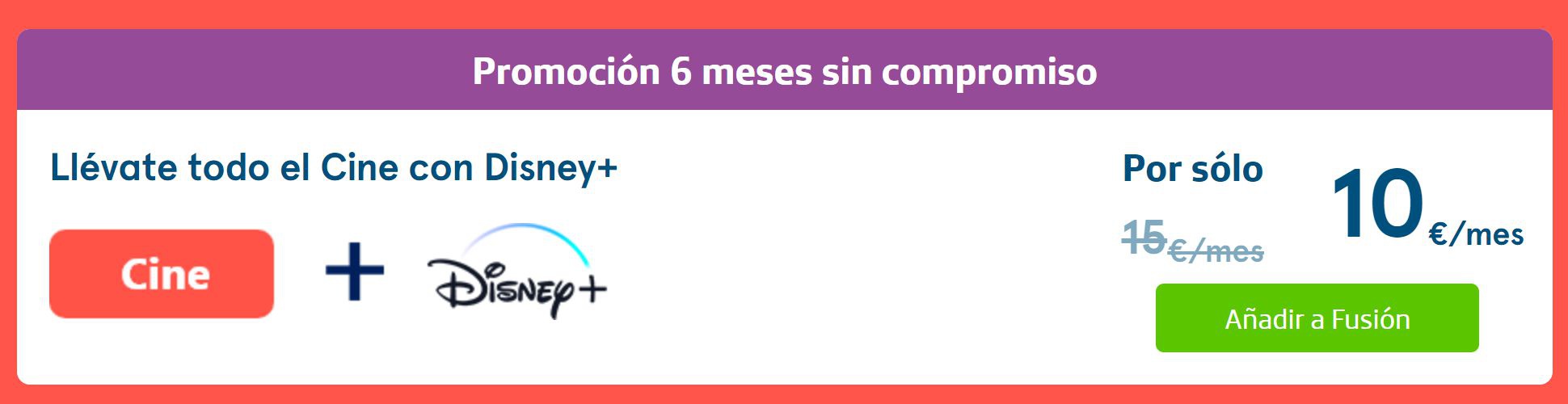 Ese precio será el definitivo del producto, pero ahora podemos conseguirlo por sólo 10 euros al mes durante 6 meses. Este es el precio del paquete Cine “normal” que no incluye la plataforma en streaming Disney+. Además, el paquete con Disney incluye una nea móvil con 200MB y 0cts/min.