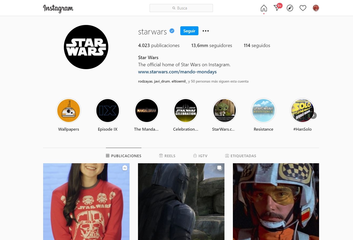 En el caso de Instagram, el perfil ofrece contenido mucho más visual. Entre sus últimas publicaciones hay información sobre merchandising oficial en formato Reels, vídeos con tráiler de los últimos capítulos de The Mandalorian, ilustraciones realizadas por artistas conocidos y también homenajes a actores de la saga que ya no están entre nosotros, como David Prowse, el actor que interpretó a Darth Vader en trilogía original.