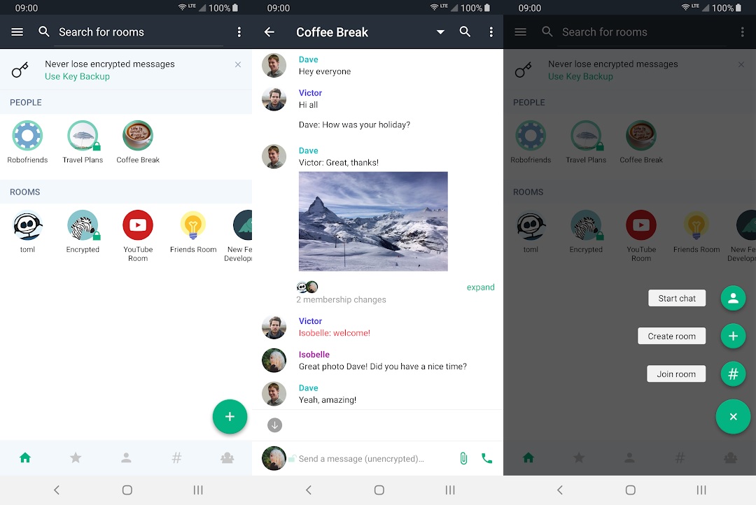 En la aplicación vas a poder crear tu propia sala de chat, para que tengas así contacto con amigos, colegas o familiares, a los que invitar a dicha sala. También podrás sumarte a alguna sala ya existente, pero se da también la posibilidad de enviar mensajes directos a una persona únicamente, por si deseas hablar solo con alguien en concreto. Los mensajes que se envían en la aplicación tienen cifrado de extremo a extremo (aunque en algunos chats grupales no siempre es el caso). Además de aplicación para Android, podemos acceder desde el ordenador también. Como en una app de mensajería cualquiera, podremos compartir archivos y mandar emojis y GIFs en los chats.