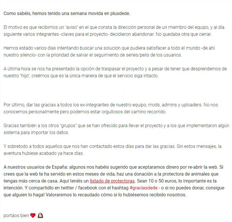 Plusdede.com se había convertido en la web de series y películas mas destacada de España, pero sin saber exactamente el motivo, desapareció sin mas. Podemos hacernos una idea que el motivo de peso es la ley de protección de derechos de autor, la cual habrá obligado a sus dueños a deshacerse de ella y que otros tomen el relevo.