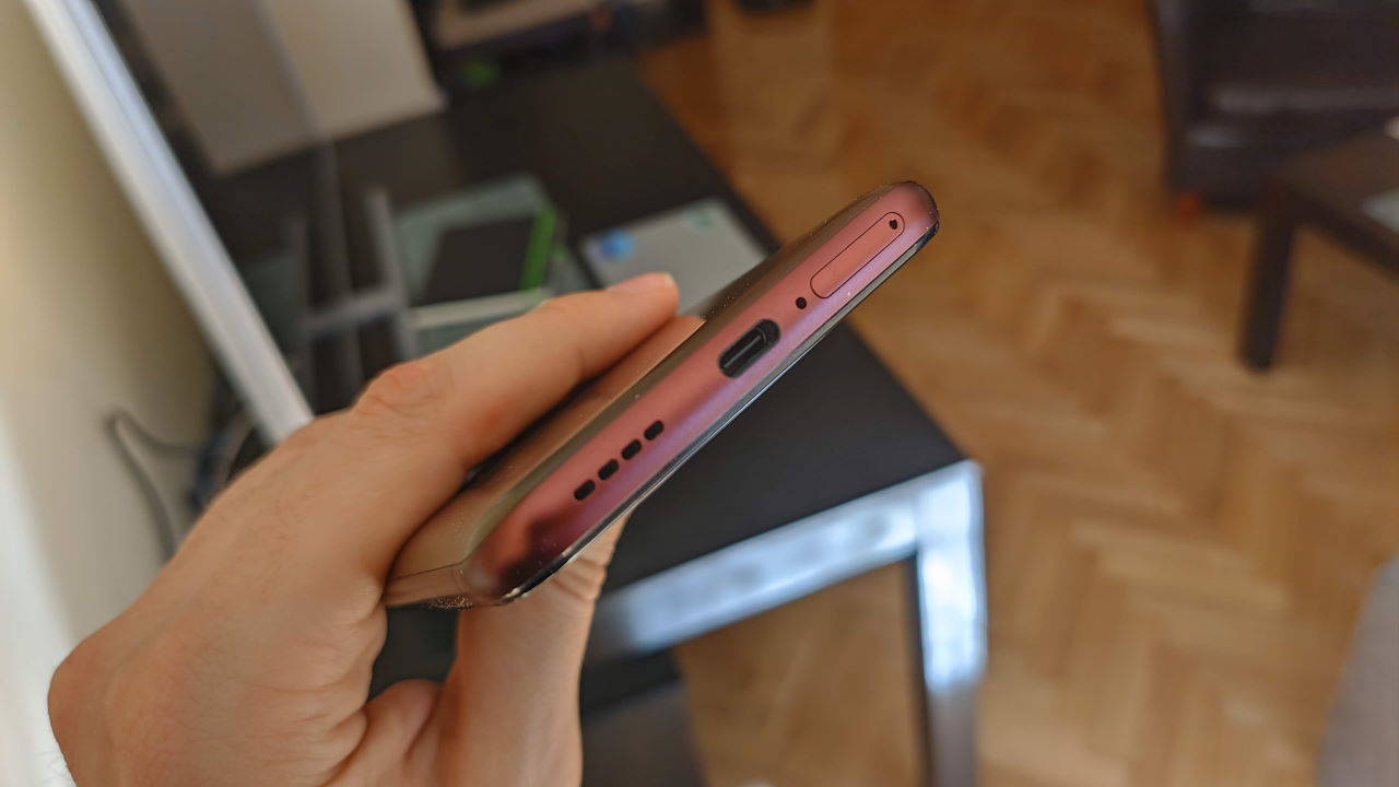 Y el marco inferior, donde tenemos micrófono, altavoz, puerto USB C y ranura para tarjeta SIM. Es importante destacar que sólo tiene soporte para una SIM, no pudiendo optar ni a una doble SIM ni tampoco a una expansión de tarjetas microSD.