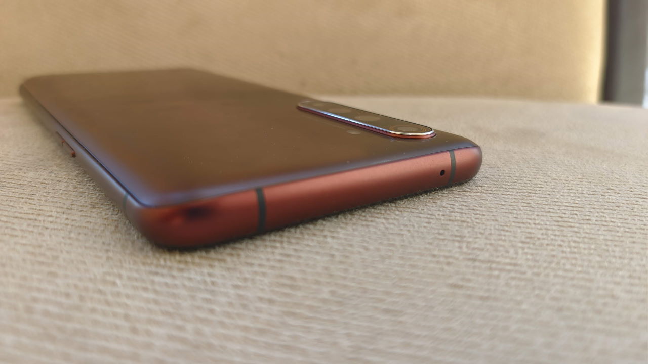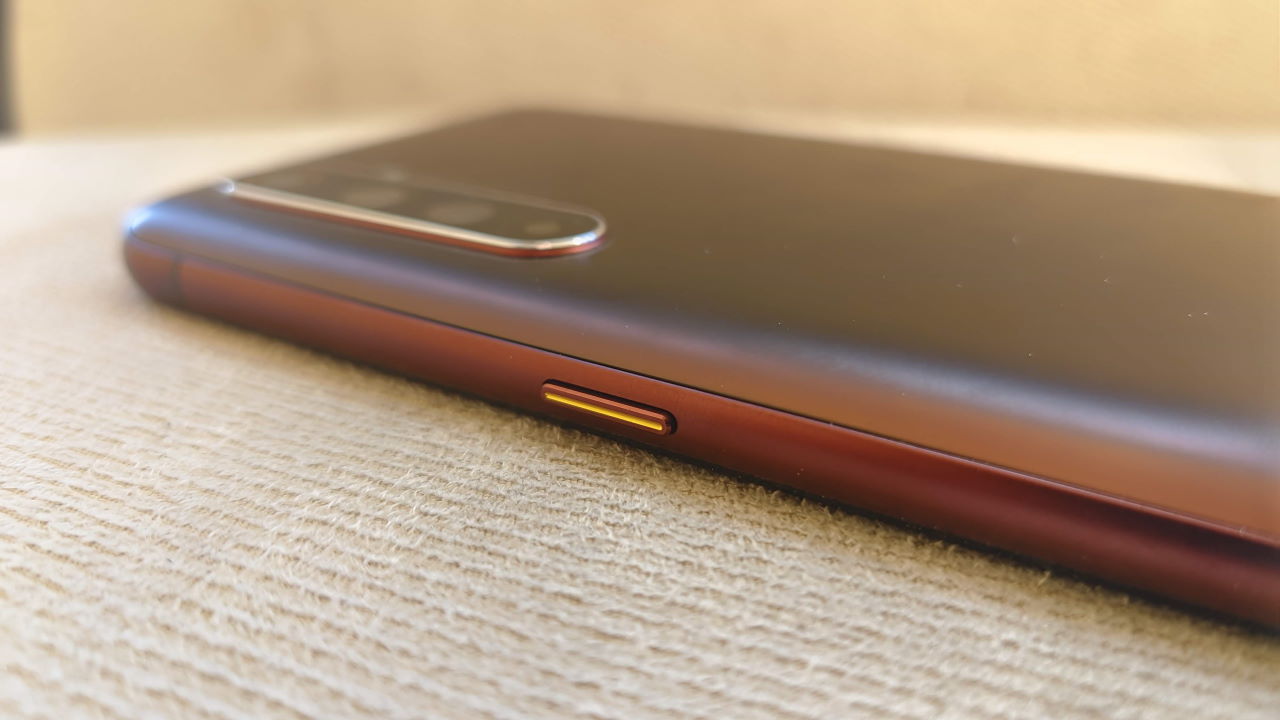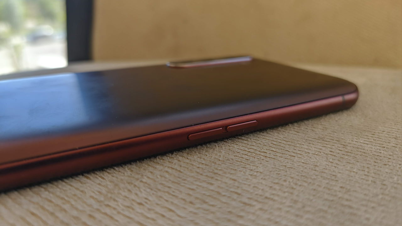 Los marcos laterales son también estilo mate, en un rojo ligeramente más intenso. En el lateral izquierdo apreciamos los botones de volumen.