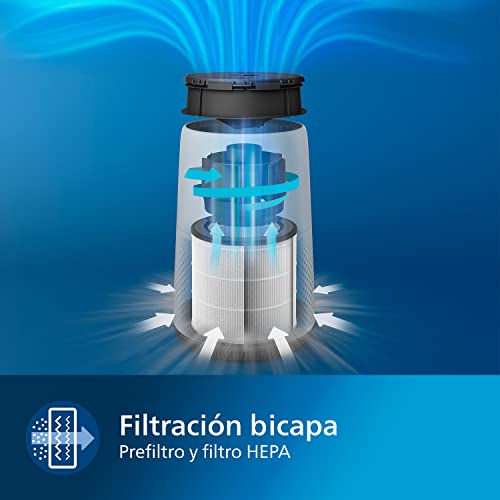 Por ello, el Philips Serie 800 cuenta con la máxima tecnología de purificación con una serie de filtros HEPA que maximizan la eficiencia bajo las peores condiciones de contaminación. Esta tecnología superpone diferentes tipos de filtros para atrapar partículas grandes, medias y microscópicas.